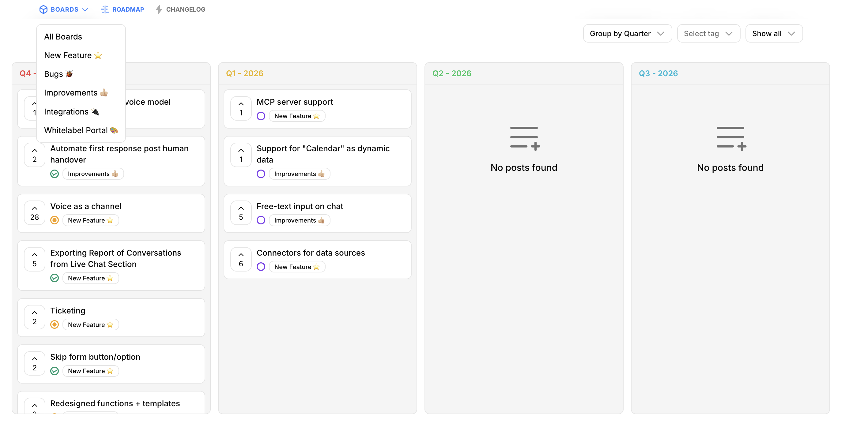 Requesting a roadmap feature. The feature should let users submit ideas, report issues, and vote on requests. This helps your team see what matters to users and plan updates. It also helps users track progress and know the status of their requests.