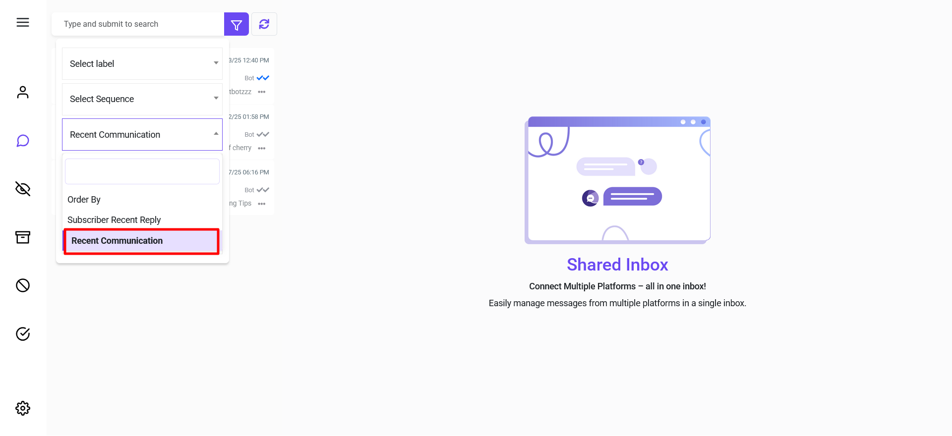 To sort messages sent via the HTTP API or through broadcasting, please select “Recent Communication” in the Shared Inbox.