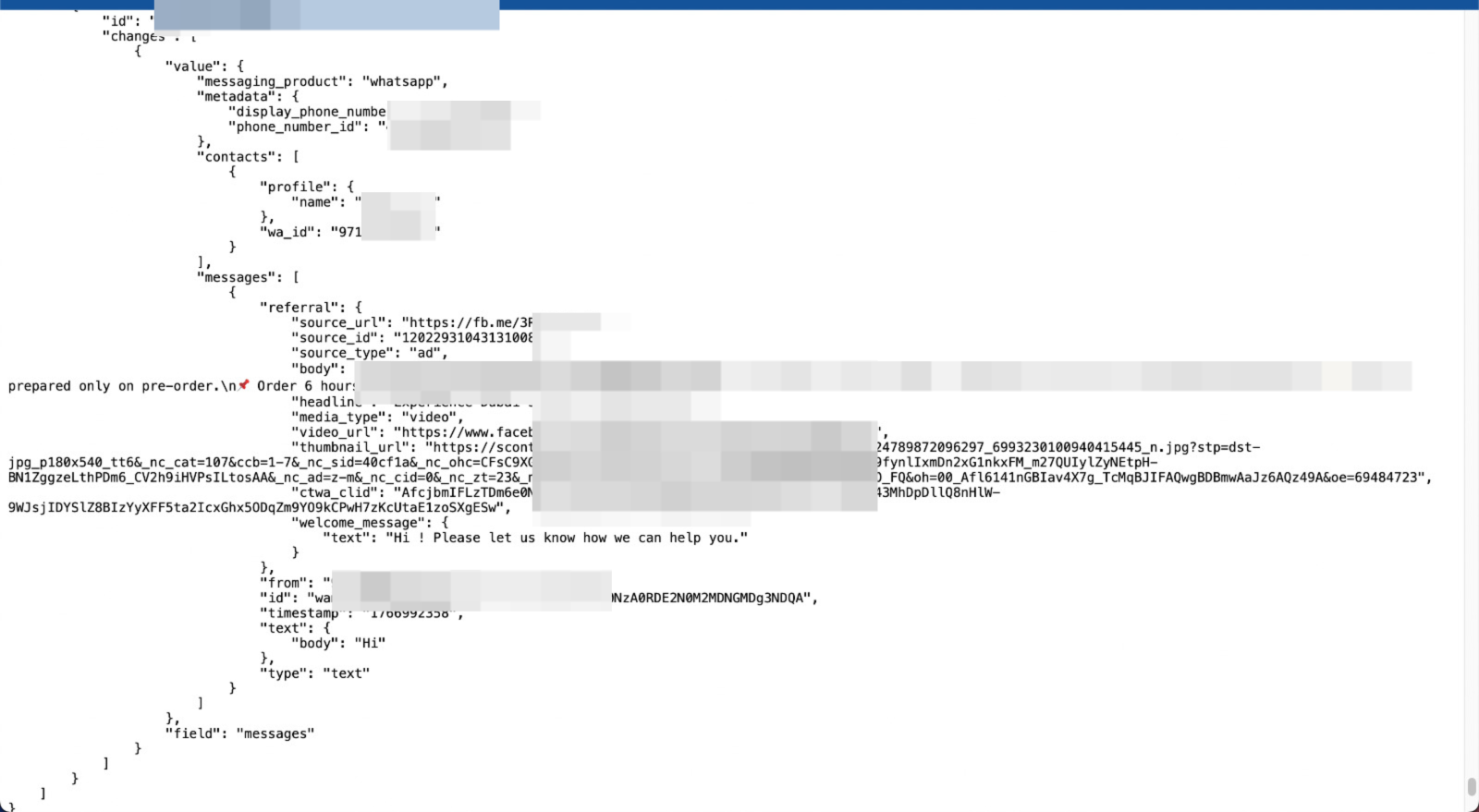 from Meta, if the whatsapp message is initiated by Meta Ads means they are providing the Ad Details like "source_url, source_id, source_type , body, media_type , video_url , thumbnail_url , welcome_message text" like this information,